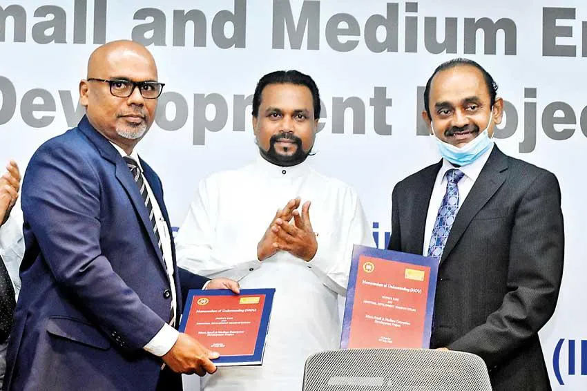 Industrial Development Board (IDB) Chairman Upasena Dissanayake (left) and People’s Bank Chairman Sujeewa Rajapakse (right) exchange agreements whil...