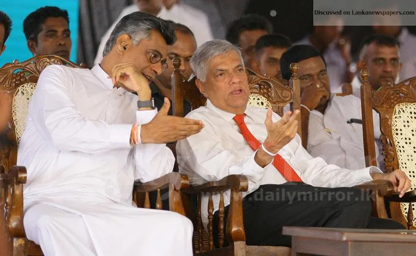 Prime Minister Ranil Wickremesinghe is seen in a conversation with Megapolis and Western Development Minister Patali Champika Ranawaka during declarin...
