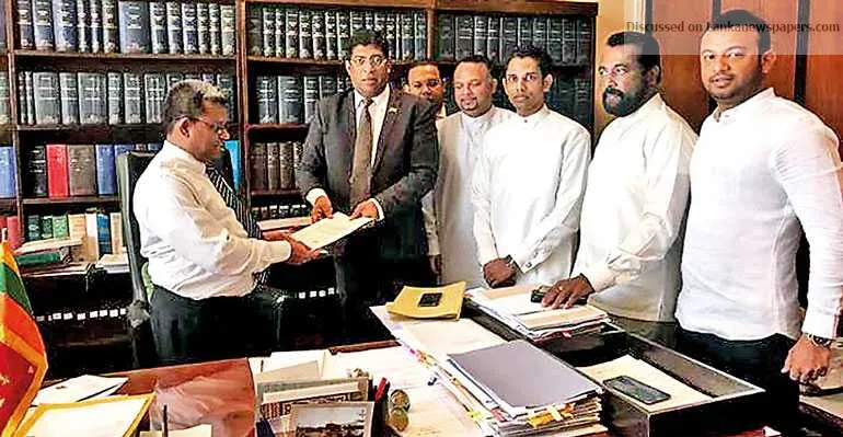 Parliamentarians Ravi Karunanayake, Navin Dissanayake, Chathura Senaratne, Nalaka Kolonne, Hector Appuhamy and Kavinda Jayawardana handing over a copy...