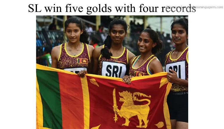 Sri Lanka won five Gold medals including a clean sweep in the Men’s 400m at the 3rd South Asian Junior Athletics Championship started at Sugathadasa Stadium yesterday. Coming off a chaotic night SL sprinters dazzled with four medals which also includes four new meet records and two Sri Lanka junior records while high jumper Tharindu Dasun clinched Gold in his field events. All eyes were on team captain Aruna Darshana from Akuramboda CC who bettered his personal best, Sri Lanka junior record and set new meet record of 46.55 seconds to win the Gold medal while his fellow Sri Lankan Pasindu Kodikara (46.99sec) finished second for the Silver with Pabasara Niku (47.43 sec) finishing third to make a clean sweep. The trio later received their medals from a 400m national champion and Asian Games Gold medalist Sugath Thilakarathne. Before that, Dilshi Kumarasinghe from A. Rathnayake CC Walala clinched an easy Gold medal setting another new meet record with a 54.47 seconds run in the Women’s 400m. Dilshi whose pet event is 800m will be eyeing to clinch the double today winning the event. Dasun was the first to deliver a medal for Sri Lanka jumping 2.04m against the heavy wind in his run up. Dasun hailing from Mahinda College Galle is training under High Jump National Champion Manjula Kumara Wijesekara was eyeing 2.14m to qualify for the Asian Junior Championship but failed to make it due to jumping against the wind. Kandy sprinter Amasha de Silva dazzled with two Gold medals on the day as she delivered the first Gold medal in track events for Sri Lanka clocking a championship record and a new personal best of 11.92 seconds in the 100m final. de Silva hailing from Swarnamali Girls College Kandy also anchored SL 4x100m Women’s Relay team to a Gold as 17 year old Shelinda Jansen from Gateway College ran a perfect bend in the starting lap closing the gap with the Indian team and changed the baton to fellow Gateway sprinter Sharmila Jan who held on to Indian runner and did a safe baton change with Safiya Yamic from Viharamahadevi GC Kandy who then changed to her fellow Kandyan training mate Amasha who gave no chance to India. They set a new meet record and a new Sri Lanka junior record. 17-year-old Shelinda also won the 100m bronze medal with a personal best of 12.28 seconds. Amasha will now eye to increase her Gold count with wins in the 200m and 4x400m today. Heartbreak Sri Lanka had a few heart breaking incidents at the meet where the men’s 4x100m Relay team dropped the baton while Gold medal prospect Ridma Nishadi failed to win it. Sri Lanka were leading the relay until the second lap runner changed the baton with the third lap runner Chamod Yodasinghe who could not hold on to the baton properly and he dropped the baton breaking hearts of the team members as well as many who was cheering from outside. In the Women’s Long Jump being the only jumper who had leapt over the 6.00m mark Ridma Nishadi was the favourite to win the Gold medal but could only leap 5.91m as she was beaten by India’s Punitha Ramasamy (5.95m). Several eye brows were also seen raised towards Ridma’s coach, Chandimal Niroshan who was more focused on safeguarding controversial manager Anil Weerasinghe misleading athletes to sign false letters rather than focusing on Ridma’s training. Today will be the second and last day of the championship . Results: Men: Javelin Throw: 1. Arshdeep Singh (India) 71.47m, 2. Pragathi Ranawaka (Sri Lanka) 61.71m, 3. Anjana Fonseka (Sri Lanka) 60.47m High Jump: 1. Tharindu Dasun (Sri Lanka) 2.04m, 2.Gujreet Singh (India) 2.00m, 2. S.T. Amarasinghe (Sri Lanka) 2.00m Shot Put: 1. Kiran Baliyan (India) 14.77m, 2. Anamika Das (India) 14.54m, 3. Sarisha Gunasekara (Sri Lanka) 11.51m Long Jump: 1. Lokesh Sathyanathan (India) 7.74m, 2. Rishabh Rishishwar (India) 7.43m, 3. Pramod Madubash (Sri Lanka) 7.02m Javelin Throw: 1. Arshdeep Singh (India) 71.47m, 2. Pragathi Ranawaka (Sri Lanka) 61.71m, 3. Anjana Fonseka (Sri Lanka) 60.47m Discus Throw: 1. Ajay (India) 50.11, 2. Lahiru Pathirana(Sri Lanka ) 47.37m, 3. Ashilash Bhalothia (India) 46.52 secs 110m Hurdles: 1. Kunal Choudhary (India) 14.50 seconds, 2. Mohammed Fias (India) 14.55m, 3. Sheshan Kariyawasam (Sri Lanka) 14.55 secs 100m: 1. Prajawal Ravi (India) 10.81 seconds, 2. Chanuka Sandeepa (Sri Lanka) 10.88 sconds, 3. Akash Kumar (India) 10.89 secs 400m Men: 1. Aruna Darshana (Sri Lanka) 46.55 secs, 2. Pasindu Kodikara (Sri Lanka) 46.99 secs, 3. Pabasara Niku(Sri Lanka) 47.43 secs 1500m: 1. Ankit (India) 3:51.52 secs, 2. Ajith Kumar (India) 3:53.45 secs, 3. AK Madushanka (Sri Lanka) 4:02.46 secs 4x100m: 1. India 42.85 secs, 2. Pakistan 43.03 secs, 3. Maldives 44.68 secs Women: Long Jump: 1. Punitha Ramasamy (India) 5.95m, 2. Ridma Nishadi Abeyrathne 5.67m, 3. Nethmi Megawarna (Sri Lanka) 5.67m 100m: 1. Amasha de Silva (Sri Lanka) 11.92 secs, Chaithali Guraj (India) 12.24 secs, 3. Shelinda Jansen (Sri Lanka) 12.28 secs 100m Hurdles: 1. Sapna Kumari (India) 14.19 secs, 2. Pragyan Sahu (India) 14.98 secs, 3. Bhagya Nilmini (Sri Lanka) 15.25 secs 1500m: 1. Durga Deore (India) 4:31, 38 secs, 2. Poonam Sonune (India) 4:36.65 secs, 3. J.M. Kanagarathna (Sri Lanka) 4:36.71 secs 400m Women: 1. Dilshi Kumarasinghe (Sri Lanka) 54.47 secs, 2. Subha Venkatesan (India) 55.18 secs, 3. Rachna (India) 55.70 secs 4x100m: 1. Sri Lanka 46.23 secs, 2. India 46.81 secs, 3. Bangladesh 49.82 secs Shot Put: 1. Kiran Baliyan (India) 14.77m, 2. Anamika Das (India) 14.54m, 3. Sarisha Gunasekara (Sri Lanka) 11.51m