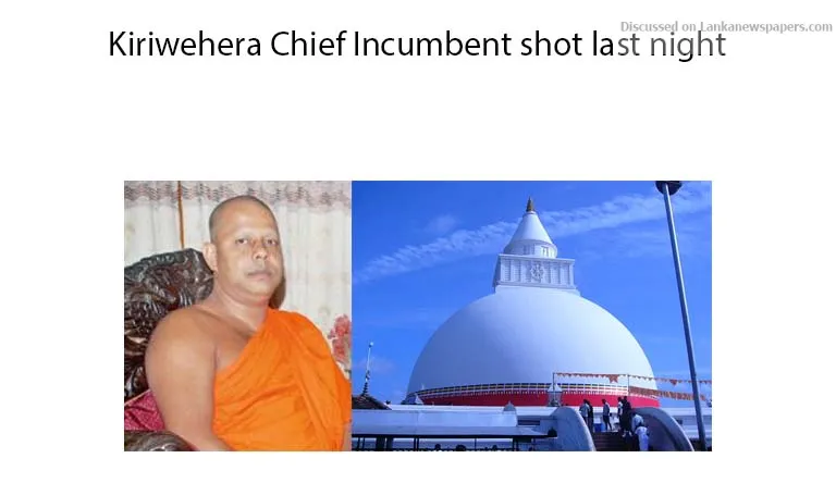 Kiriwehera Temple Chief Incumbent Venerable Kobawaka Damminda Thera and another monk were injured when they were shot by unidentified gunmen this evening, police said. They said the shooting incident occurred at 11.00 p.m at the temple. The monks were admitted to the Kataragama District Hospital but were later transferred to the Hambantota Base Hospital, police said. The motive behind the shooting was unknown. The Kataragama police are conducting investigations. Venerable Dhamminda Thera was appointed the Chief Incumbent of the Kirivehera Rajamaha Viharaya in Kataragama on December 19, 2013, by the Sangha Sabha led by the Malwatte Mahanayaka. He was a student of Ven. Dr. Aluthwewa Soratha Nayaka Thera, the former chief incumbent of the Kataragama Kirivehera Temple and Chancellor of the Uva Wellassa University passed away at the age of 70 on September 27, 2013, and took over the post after his demise.
