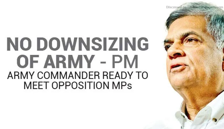 Prime Minister Ranil Wickremesinghe yesterday (18), told Parliament that Army Commander Lieutenant General, Mahesh Senanayake was willing to meet Opposition Parliamentarians to explain the truth behind allegations that the Government was attempting to reduce numbers in the Army cadre. Wickremesinghe responding to a question by JO Parliamentary Group Leader, Dinesh Gunawardena under Standing Order 27(2), said there were allegations that the Government was attempting to reduce numbers in the Army cadre and reduce the military strength in the country. Gunawardena said, “According to information we have, 24,266 military personnel including 1,000 Army officers attached to 33 divisions from across the country will be withdrawn and 100 military bases in the country including in the Northern Province, are to be removed. Because of this at least 1,000 Army personnel attached to 33 divisions will be deprived of promotions. This is how this Government is trying to take revenge from war heroes. This is following orders from the UNHRC in Geneva. These acts break the morale of our troops. We should not allow this to happen. “The Government is attempting to take revenge from war heroes at administrative level but is presenting Cabinet Papers to give compensation to former LTTE cadres. They grant funds to build monuments for LTTE soldiers who died by consuming cyanide. This is a serious problem. I request the Government to explain this matter.” Premier Wickremesinghe in response assured that the Army or any other security service in the country would not be downsized. He said, “The Army has proposed restructuring plans and the Government has given permission. The decision to restructure was made by the Army and not by me or by the President. Decisions regarding the Security Forces are made by military officials. The Government has nothing to do with such things. The Army will restructure according to the time and demand but it will not be downsized.” He said the British Army also went through restructuring after the Second World War. “But we are not cutting down on military ranks and numbers like how they did. The Sri Lankan security forces are well recognized today. That is why they have been called to be a part of the UN Peace Keeping Force in Mali. Also our security forces will play a major role in ensuring the security of the Indian Ocean region as well”, the Premier added. “I called the Army Commander last morning to get more details on this matter. He told me that he would like to meet the Opposition to explain the real situation behind the restructuring process”, the Premier noted. Speaker Karu Jayasuriya then instructed the Government to make arrangements for the meeting. State Minister of Defence, Ruwan Wijewardene replying to Gunawardena noted that a few brigades may be merged but added that there would be no decrease of numbers. “Some people may say the Army would be weakened by doing so but that is not the truth. The number of soldiers and officers serving the Army will not be reduced. This is an administrative decision to restructure made by the Army itself. Some brigades in the Army do not have the number of personnel as stipulated. He said downsizing will not happen in such circumstances”, Wijewardena noted. Moreover, Wijewardena said that it was wrong for the Opposition to allege that 100 Army camps in the Northern Province will be dismantled. No Army camp has been dismantled in the North and there is no plan to do so in the future, he added.