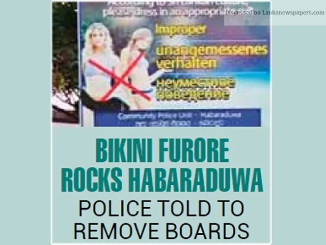 The Habaraduwa Police yesterday said they were forced to place signboards with a message to foreign visitors to dress modestly while in public places, following repeated requests from local groups that included the clergy, schools and villagers. An official with the Habaraduwa Police said that the move was aimed purely at informing foreign visitors on the local sentiments and culture, and it was not intended to offend any particular person and if that was the case then it is regretted. He said a large number of foreign visitors, mainly women are known to be scantily dressed in beachwear even when they are moving in crowded public places which causes embarrassment to the local people. “Beachwear should be confined to that particular area and not elsewhere as it is the case even in many other countries,” he said. He added that the Police were taken by surprise by the protests over the sign boards from local quarters particular the hotel and entertainment industry and therefore they were compelled to take them down. The billboards depicted two foreign women clad in bikinis and urged visitors to be more mindful of the local sentiments, culture and values. Officials with the Tourism Development Authority said that such messages are not good for tourism and therefore they could not be tolerated for whatever reasons and that it was advisable to have them removed as it is the case at the moment.