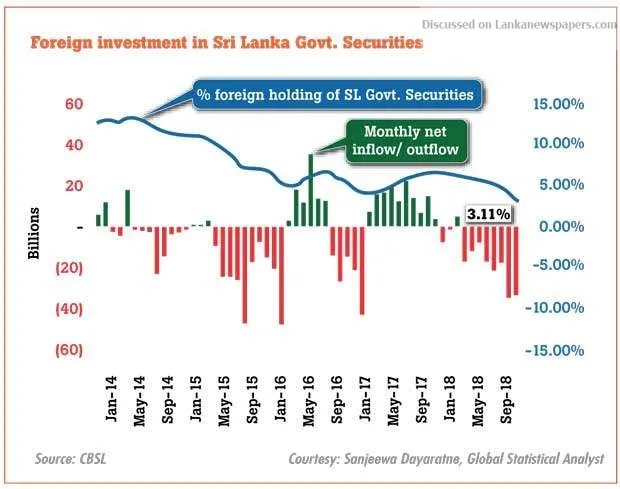 Sri Lankan rupee weakened 19 percent during 2018 and foreigners sold a net Rs.159.9 billion of G-secs during the year, a decline of 55 percent from a year earlier.