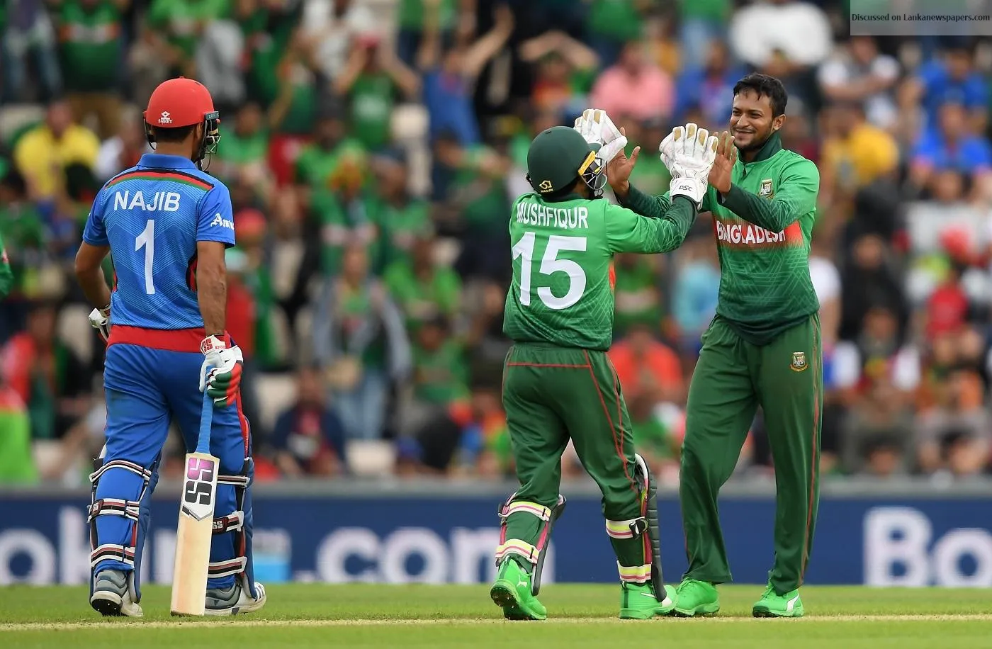 SOUTHAMPTON, England (Reuters) - Bangladesh talisman Shakib Al Hasan reclaimed his position as the World Cup’s leading scorer after producing a stellar all-round display to secure his team’s 62-run victory against Afghanistan on Monday. Put into bat, Bangladesh posted a strong 262 for seven on a slow track after Shakib, who made 51, forged half-century partnerships with Tamim Iqbal (36) and Mushfiqur Rahim (83). The left-arm spinner went on to return the tournament’s best bowling figures of 5-29 as Afghanistan, all out for 200 in 47 overs, succumbed to their seventh defeat in a row in the tournament. Afghanistan captain Gulbadin Naib won the toss and elected to field two days after his team’s narrow-miss against India at the same Hampshire Bowl. As has been their practice, off-spinner Mujeeb Ur Rahman began with the new ball and tasted success in his third over when Liton Das drove him to short cover. Mohammad Nabi breached Tamim’s defence and Afghanistan nearly had two-in-two after Shakib was adjudged lbw to Rashid Khan in the first ball of the next over. The batsman immediately reviewed and got the decision overturned after the ball-tracker confirmed the ball would have sailed over the stumps. Shakib added 61 runs with Mushfiqur but Mujeeb dismissed him and Soumya Sarkar in a two-wicket burst to peg back Bangladesh. Shakib’s fifth 50-plus score in six innings contained just one four, illustrating the slowness of the track where boundaries were a rarity. He now has 476 runs in the tournament, leapfrogging Australian opener David Warner (447), after yet another stellar performance. Mushfiqur brought up his fifty with the only six of the Bangladesh innings and also hit four boundaries. After sending down 10 overs of medium pace, Naib returned half an hour later to give Afghanistan a strong, if not flying, start. He and Rahmat Shah helped Afghanistan inch towards the 50-mark when Bangladesh captain Mashrafe Mortaza introduced Shakib and the left-arm spinner struck with his fifth delivery. Shah attempted a timid pull shot which found Tamim at mid-on and departed for 24. Shakib derailed Afghanistan’s chase in the 29th over when he dismissed Naib for 47 and, two balls later, sent back the scoreless Nabi. The match was effectively over when former captain Asghar Afghan fell to Shakib in the 33rd over. Samiullah Shinwari made a defiant 49 not out down the order but was left stranded.