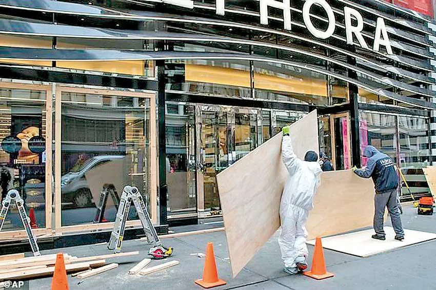 In New York, carpenters in protective gear were seen boarding up a closed beauty store in Manhattan (DM) US, (Daily Mail), 23 March 2020 - Ohio and Louisiana have joined nine other states in ordering residents to stay at home to help curb the spread of the coronavirus.