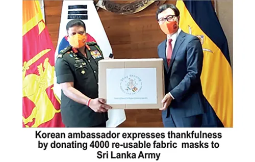On October 14 Woonjin Jeong, ambassador of the Republic of Korea to Sri Lanka met with Lieutenant General Shavendra Silva, Chief of Defence Staff and Commander of the Army who is also the Head of National Operation Centre for Prevention of COVID-19 Outbreak (NOCPCO) at the army headquarters. The ambassador donated a consignment of 4000 re-usable fabric masks for distribution among army personnel engaged in controlling COVID-19 especially in the area of Gampaha. Appreciating the great relationship shared between Sri Lanka and the Republic of Korea over time, Lieutenant General Shavendra Silva stated that both countries should strive to harness the full potential in areas of defence cooperation and military logistics. He looks forward to strengthening the bilateral cooperation in military affairs and technological exchanges in time to come. He also expressed his gratitude to the government of Korea for recruiting a substantial number of Sri Lankan migrant workers annually. Furthermore as the Head of National Operation Centre for Prevention of COVID-19 Outbreak (NOCPCO), Lieutenant General Shavendra Silva assured the ambassador that they have devised and operated an efficient mechanism to control the pandemic. They have the ability to predict the number of patients and most cases have been found among those who have been already placed in quarantine. Ambassador Woonjin Jeong mentioned he was “deeply impressed by the effective measures by the Sri Lankan government to cope with Covid-19. I am confident that the number of COVID-19 cases in Sri Lanka will decline due to the effective mechanism adopted by the military and health sectors of the country. Also, there has been no single infection case among the Korean community in Sri Lanka. On behalf of my country, Korea, I would like to thank Sri Lanka Army for protecting Korean residents here in Sri Lanka amid Covid-19 and creating a secure and stable environment for them to reside in. I would like to give my appreciation to all Anti COVID-19 team led by the Army that has been dedicated to the fight against COVID-19 for the Sri Lankan people including Korean residents.” He further stated that the Republic of Korea has also successfully coped with COVID-19 like Sri Lanka and that there was no single COVID-19 case from more than 1000 Sri Lankan workers repatriated from Korea until now. 23,000 Sri Lankans live in Korea very safely. He emphasized that Korea and Sri Lanka are among the safest countries in the world at present. The Ambassador affirmed his commitment to promote Sri Lanka among the Korean community and strengthen the bilateral ties in the field of tourism, defence and other areas of interest. “Many Korean people are looking forward to visiting Sri Lanka once COVID-19 is curtailed” he said. The Ambassador stated that the donation of masks as a gesture of goodwill is a reflection that the long lasting friendship and mutual trust between the Republic of Korea and Sri Lanka will grow only stronger through the joint fight against COVID-19. Ambassador Woonjin Jeong asserted that “I have no doubt that the Korea and Sri Lanka will persevere because together we will overcome every hardship, The Republic of Korea will always stand with Sri Lanka in the battle against the pandemic”. He mentioned that these masks which were manufactured by a Sri Lankan social enterprise are presented as tokens of appreciation for the Sri Lanka Army for their invaluable services rendered in controlling COVID-19 especially in Gampaha. The Army Chief Lieutenant General Shavendra Silva in return thanked the Ambassador for the thoughtfulness and the appreciation of the army personnel and this gesture will deepen the bilateral relations between Sri Lanka and the Republic of Korea.