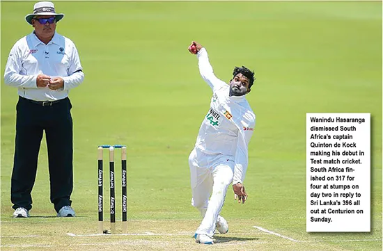 Sri Lanka have been severely handicapped in the opening Test match against South Africa as a couple of injuries reduced them to virtually nine men here at the Centurion yesterday. They came into the second day’s play after being informed that Dhananjaya de Silva has been ruled out of the series with a thigh strain and then Kasun Rajitha pulled off with a groin injury having bowed just two overs. Dhananjaya’s solid batting had laid the foundation for Sri Lanka’s highest total in South African soil ever and the team will miss his off-spin as well which came in really handy when they won a series last time in South Africa. Sri Lanka’s first innings score of 396 all out is a commendable effort as they added 56 more to the overnight score. Their previous best was 342 all out at Newlands in 2012. There were debates about whether Dasun Shanaka deserved a place in the Test side but he has done really well. His Test match temperament was on display as he posted an unbeaten 66. Known as bit of a dasher, Shanaka was left with little choice than to go for his shots as he raced to 66 off 87 balls with three fours and five sixes. Then with injury to Rajitha, he had to share the extra burden of bowling more overs and took a return catch to dismiss Dean Elgar for 95. Elgar had added 141 for the opening wicket with Aiden Markram (68). Sri Lanka picked up four wickets for 79 runs to reduce South Africa to 220 for four. But an unbroken 99 run stand for the fifth wicket between Francois du Plessis (55) and Temba Bavuma (41) helped the Proteas to take control of the game.