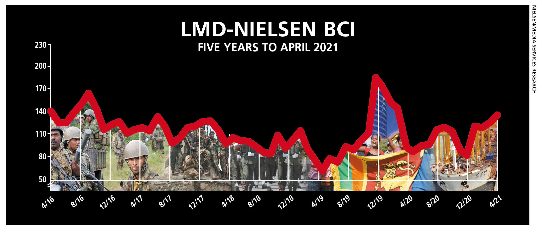 As the country looks to accelerate its recovery, striking a balance between supporting the economy through the pandemic and ensuring fiscal sustainability will be crucial, and the World Bank points out that a reform programme could serve as a fiscal anchor to help reduce debt vulnerabilities and curtail its sovereign risk. Meanwhile, the latest LMD-Nielsen Business Confidence Index (BCI) survey – which was carried out in the first week of April – suggests that the outlook is more positive as sentiment improved ahead of the festive season. THE INDEX The BCI witnessed an increase for the second consecutive month, surging 12 basis points to 138 in April from the previous month, registering the highest point for the index over the last 12 months. Notably, this also places it 21 basis points above its average for the period (110) and 11 notches higher than the all-time median (127). Nielsen’s Director – Consumer Insights Therica Miyanadeniya explains: “The New Year euphoria seems to have taken hold of both businesses as well as the general public. Sentiment was high [at the time of the survey] ahead of the Avurudu celebrations – after a year when a nationwide curfew was in force in April last year.” SENSITIVITIES The impact of the coronavirus continues to be cited as the most pressing issue in business circles. Inflation, and bribery and corruption, are also viewed as major concerns. Meanwhile, the spread of COVID-19 is seen as the main issue for the nation at this juncture, followed by the economy, and bribery and corruption. PROJECTIONS While sentiment improved ahead of the festivities in April, Miyanadeniya states that the BCI and Consumer Confidence Index (CCI) are likely to plummet if this is followed by a third wave of the coronavirus. “If not, as businesses have begun to pick up momentum, both indices are likely to continue to rise, provided that the economy and political climate in the country are perceived to be stable,” she adds. In the April edition, we asserted that a downward trend in COVID-19 cases and deaths, and Sri Lanka’s ability to secure more doses of the vaccine, will impact sentiment. While the roll out of the second dose of the vaccine has commenced – and new consignments are reportedly due soon – the rise in cases following the festive period along with new restrictions imposed by the authorities could undermine sentiment in the near term. What could add to the misery is the prospect of political gamesmanship leading to instability, which of course isn’t new to Sri Lanka! – LMD