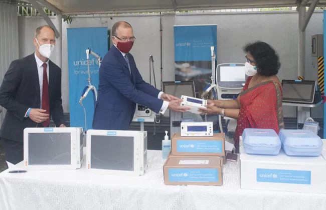 UNICEF today handed over a consignment of critical equipment to the Ministry of Health, to support the government’s response to the COVID-19 situation in Sri Lanka. The supplies include essential intensive care unit equipment such as ventilators, nebulizers, multipara monitors, and pulse oximeters. The equipment was handed to Lakshmi Somatunga, the Additional Secretary for Public health Services, representing the Minister of Health, Pavithra Wanniarachchi by Christian Skoog, UNICEF Representative to Sri Lanka, and David McKinnon, the Canadian High Commissioner to Sri Lanka. In her remarks, delivered by Ms Somatunga, Minister Wanniarachchi said, “I would like to express appreciation for the support of UNICEF and Canada for this contribution. This kind of collaboration, before and throughout the COVID-19 pandemic has demonstrated that by working together, we can save lives and help improve services to respond to urgent needs”. Speaking during the handover, Mr Skoog said, “Since the onset of the COVID-19 pandemic, UNICEF has supported the efforts of the government of Sri Lanka to ensure that critical healthcare is provided, especially to the most vulnerable, including women and children”. “The equipment we are providing today will boost the healthcare system, not only to respond to the current situation but also in the longer run in other areas”. This procurement of nearly one million dollars was made possible with the contribution from Canada to UNICEF’s Access to Covid-19 Tools Accelerator Supplies Financing Facility (“ACT-A SFF”), a global collaboration to accelerate the development, production, and equitable access to COVID-19 tests, treatments, and vaccines. “Canada is happy to make this USD 1M contribution through UNICEF. As we see in this third wave, COVID-19 is far from defeated: we will be safe from the virus only when all countries are protected. Through this support, Canada is contributing not only to urgently needed equipment but also to the strengthening Sri Lanka’s health system preparedness, which is vital for the pandemic response in the long term.”, said Mr McKinnon.