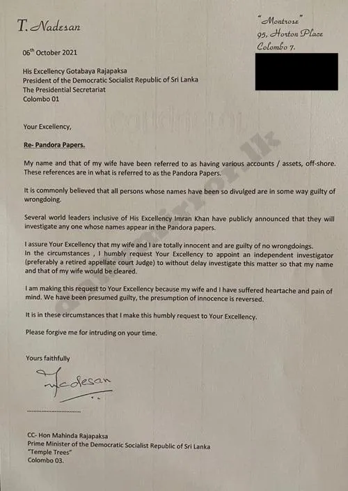 Businessman and husband of Nirupama Rajapaksa, Thirukumar Nadesan whose name has transpired in the Pandora Papers, in a letter to President Gotabaya Rajapaksa said he and his wife ‘are totally innocent and are guilty of no wrongdoing'. He has also requested the President to appoint an independent investigator to probe these allegations.