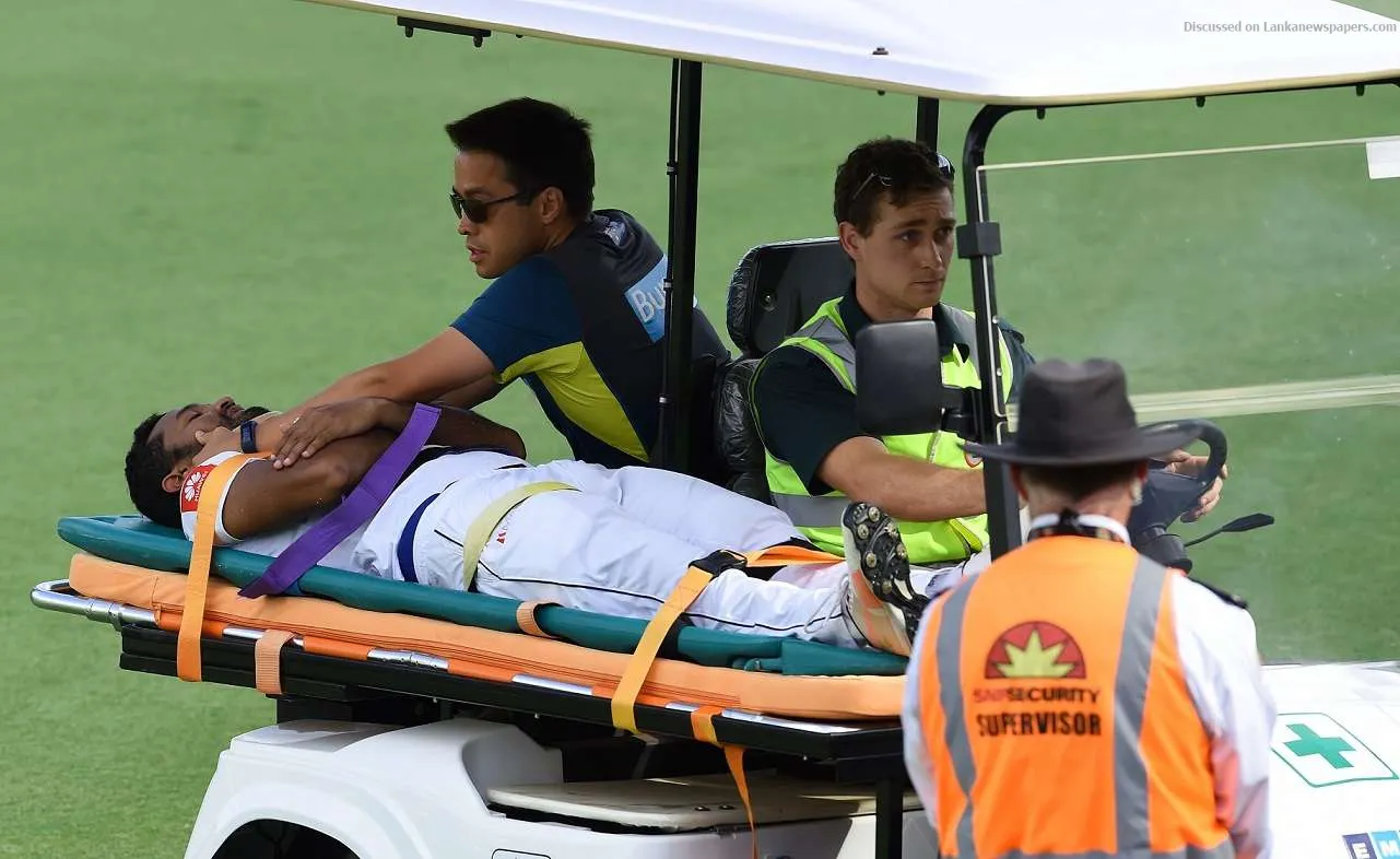 Opener Dimuth Karunaratne was stretchered off in a neck brace after being hit by a bouncer Saturday as Sri Lanka chased a massive Australian first inn...