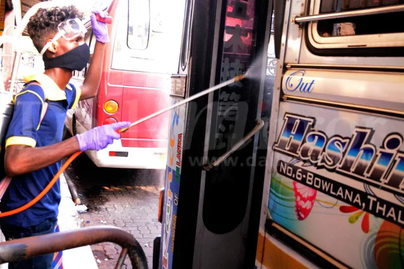Health officers fumigating buses at the Central Bus stand Pettah yesterday as per the decision taken by the government to prevent the spread of COVID ...