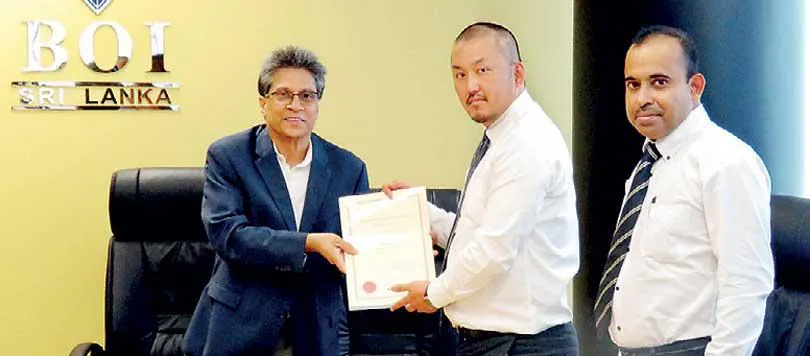 BOI Chairman Mangala Yapa formally presents Certificate of Registration to Sugano Colombo (Pvt.) Ltd Managing Director Yusaku Sugano in the presence o...