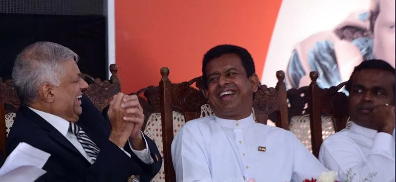 Prime Minister Ranil Wickremesinghe is sharing a lighter moment with State Minister Buddhika Pathirana at the opening of the newly constructed Sri Lan...