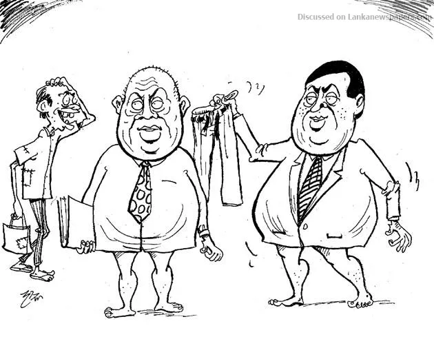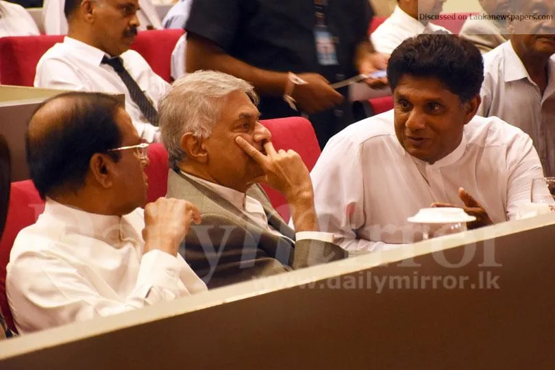 President Maithripala Sirisena and Minister Sajith Premadasa are seen having a discussion while Prime Minister Ranil Wickremesinghe looks on in the mi...