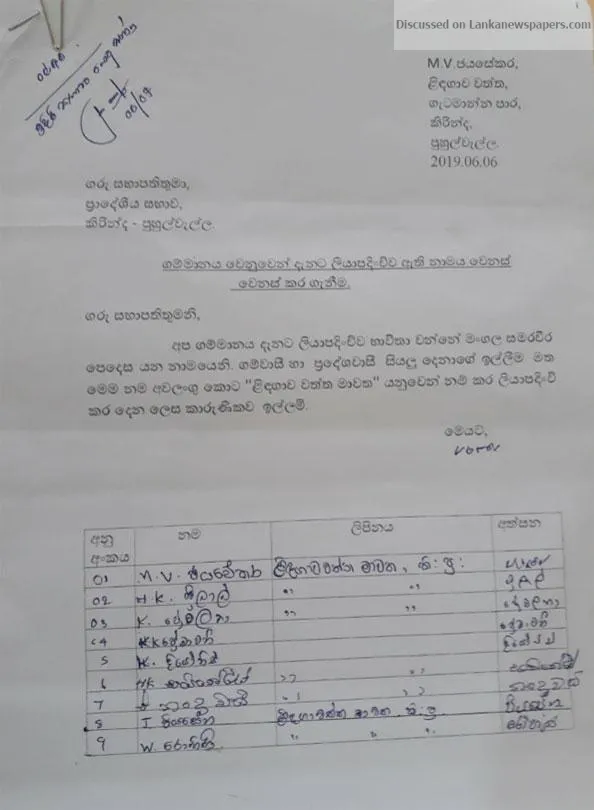 A proposal presented by the Kirinda-Puhulwella Pradeshiya Sabha to remove the name of ‘Mangala Samaraweera Pedasa’ and replace it as ‘Lindagawa ...